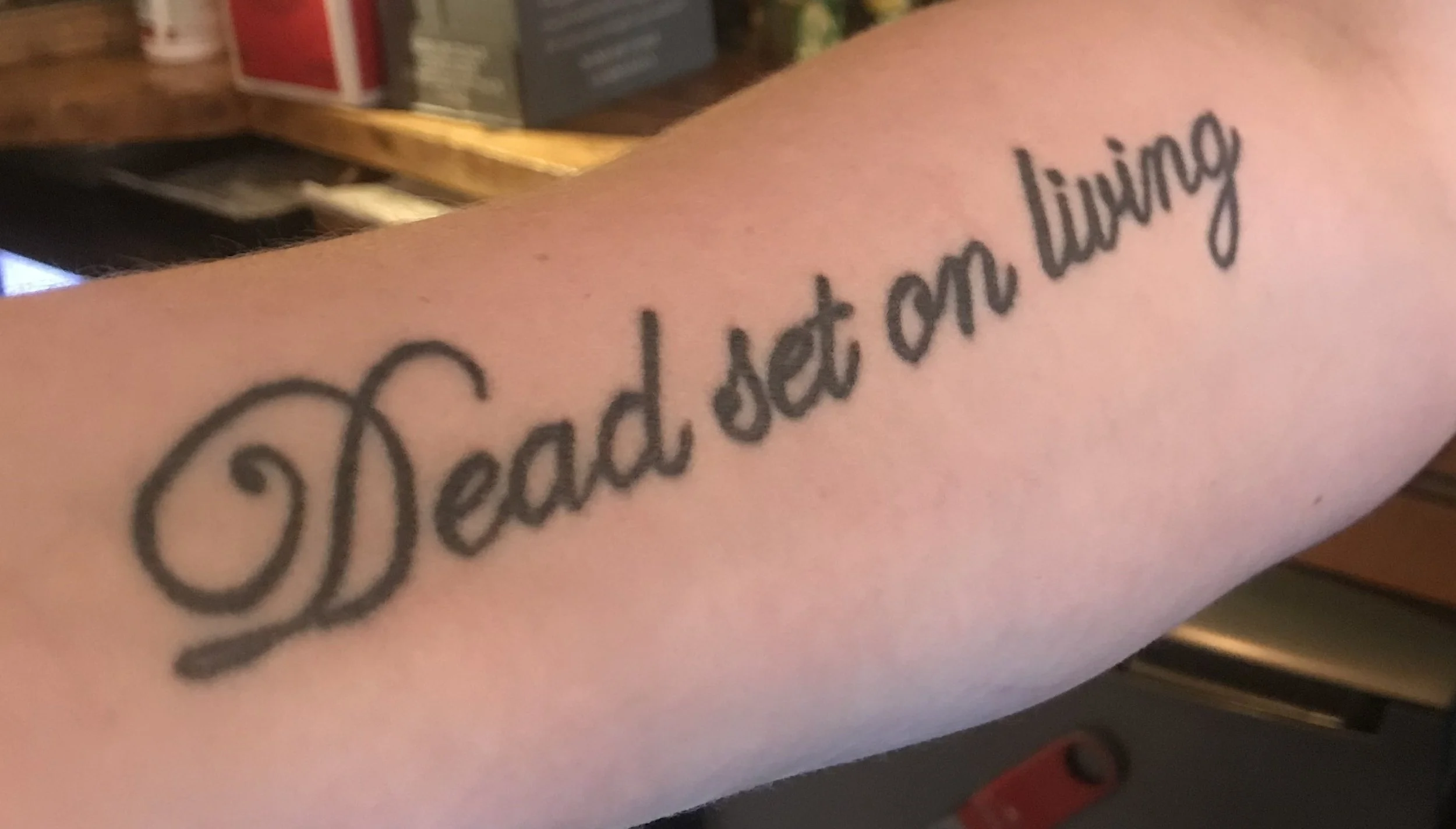 The tattoo was inked about 7 (ish) years ago and is the lyric from one of her favourite bands, ‘Cancer Bats’  other lyrics by the band are inked on her too, she has multiple tattoos.